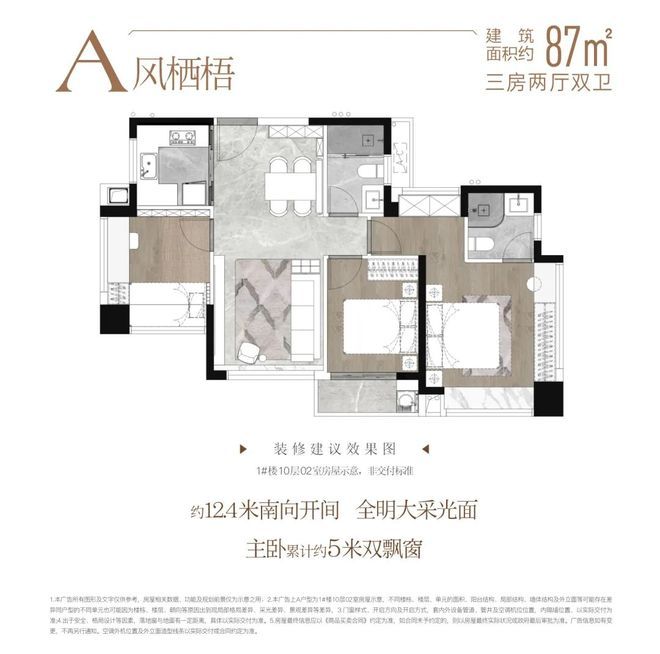 87㎡三房:实得95㎡空间,南向4开间+主卧双飘窗,类边套设计实现三面采光。