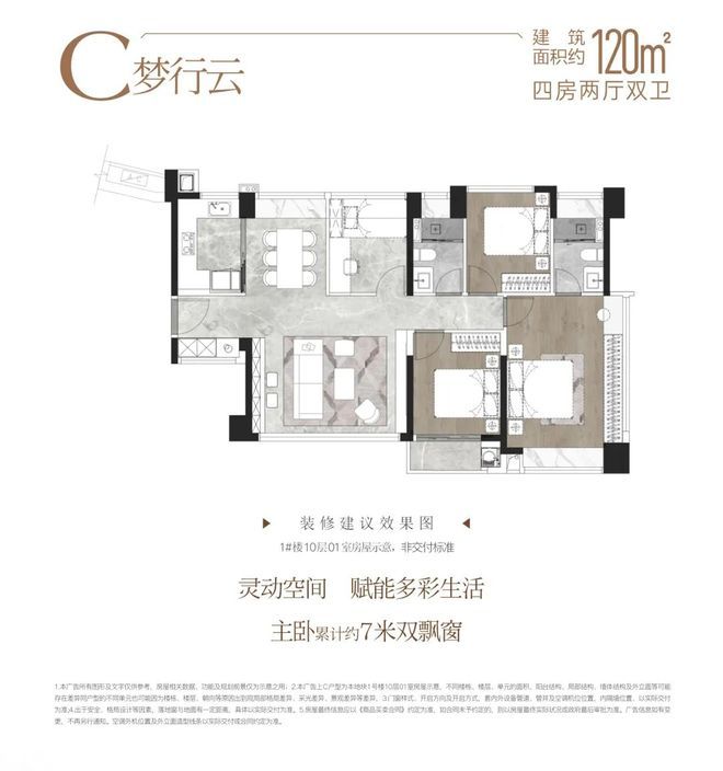 120㎡四房:双主卧套房+独立家政间,层高3.15米,拓展面积多10㎡。